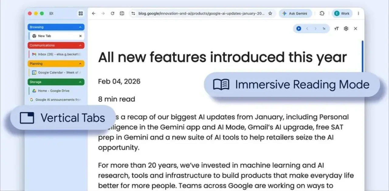 Google Chrome, kullanıcı deneyimini geliştirmeye yönelik iki önemli yeniliği devreye aldı. Dikey sekme düzeni ve yenilenen tam sayfa okuma modu sayesinde hem sekme yönetimi kolaylaşıyor hem de içerik tüketimi daha sade hale geliyor.