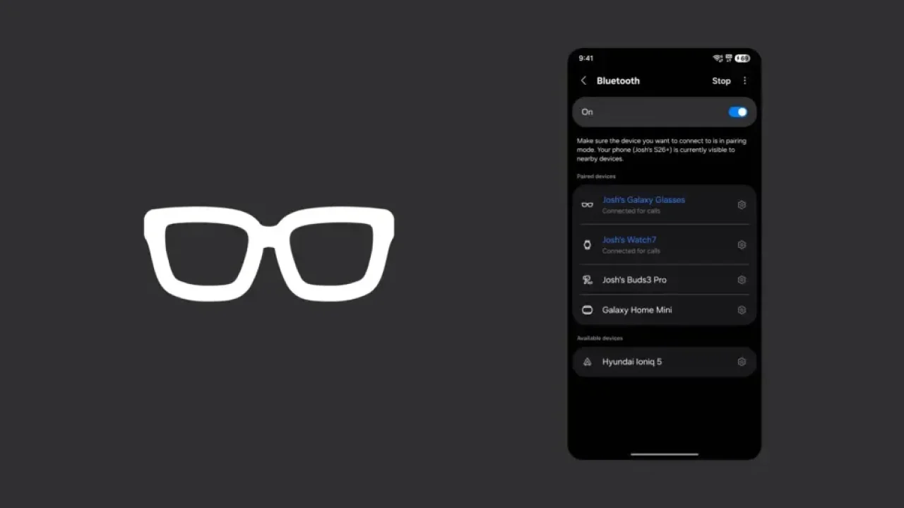 One UI 8.5 sistem dosyalarında yer alan görseller, gözlüğün Bluetooth cihaz listesinde Galaxy Buds ve Galaxy Watch benzeri şekilde görüneceğini ortaya koydu. Kullanıcılar bağlantı ekranında cihaz simgesi, ürün adı ve hızlı ayarlar butonunu görebilecek.