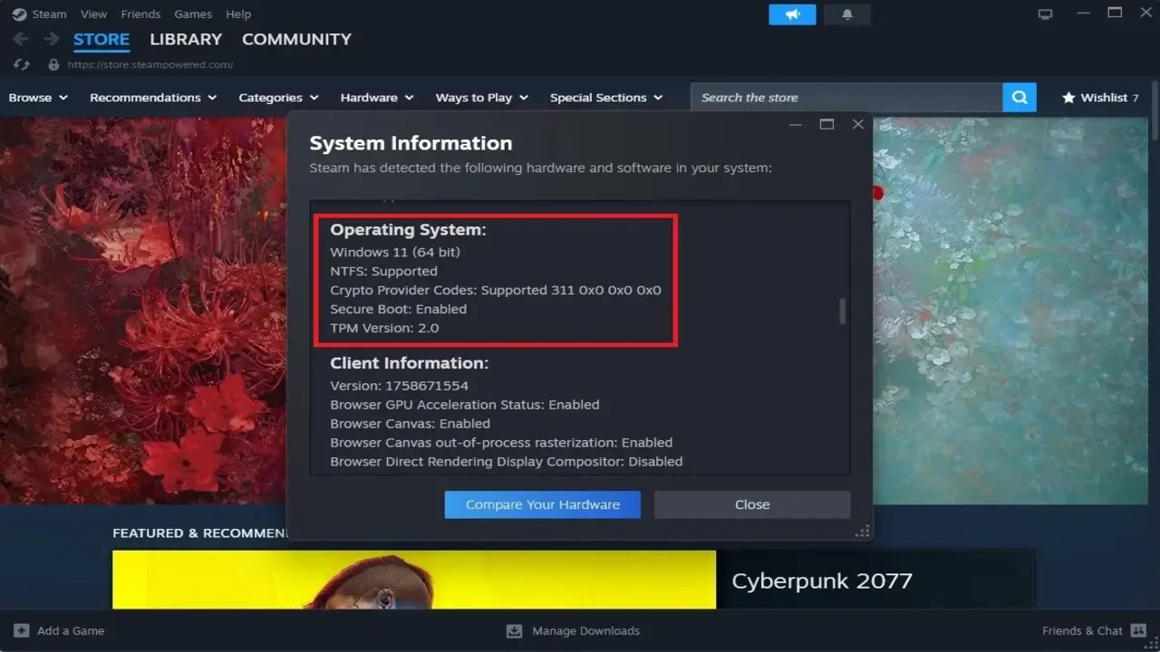 Yeni kontrol aracı şu anda Steam Beta İstemcisi’ne eklendi. Kullanıcılar, Yardım > Sistem Bilgileri menüsünden bilgisayarlarının Secure Boot durumunu ve TPM sürümünü görebilecek.