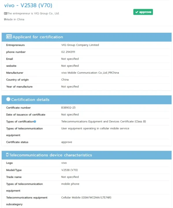 V2538 model numarasıyla sertifika kayıtlarında yer alan vivo V70’in, 2026 yılının Ocak ayında Hindistan ve Avrupa başta olmak üzere birçok pazarda resmi olarak tanıtılması bekleniyor.