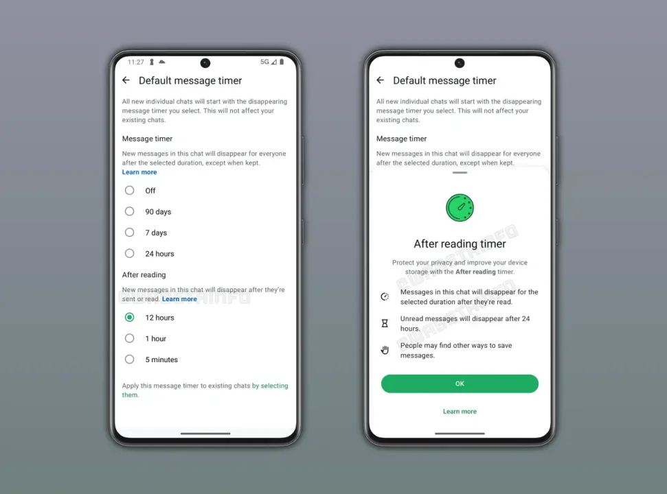 Popüler mesajlaşma uygulamasının Android için yayınladığı 2.26.15.11 beta güncellemesinde ortaya çıkan özellikle birlikte, mevcut kaybolan mesaj seçeneklerine yeni bir sistem eklenmesi planlanıyor. Böylece mesajların silinme süresi, gönderildiği andan değil, alıcının mesajı okuduğu andan itibaren başlayacak.